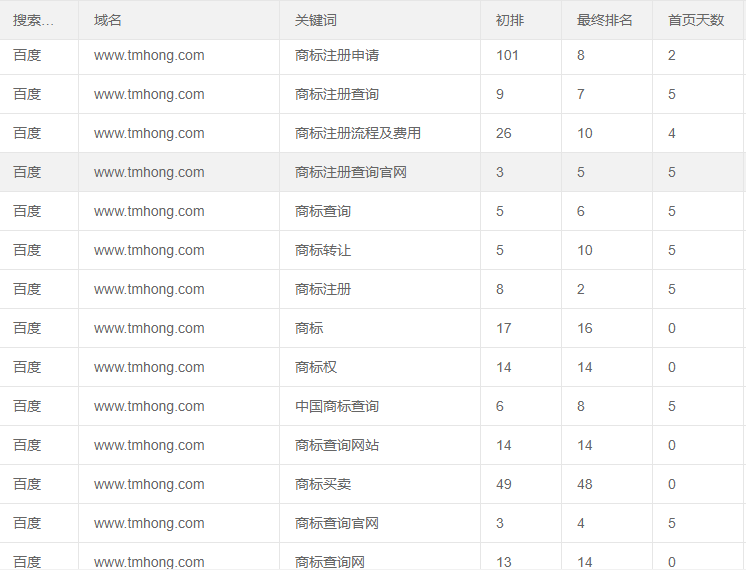 企红网(企红中国)从事商标注册相关知识产权业务,通过互联网找到我们,并经过半年时间的效果观察,最终确定与我们展开整站优化合作服务。企红网自选商标、商标注册、商标查询、注册商标、知识产权等一系列高指数词100个(指数分别在300-6000之间),经过我公司对网站做优化诊断和调整,最终帮助企红中国优化53个词到首页,其中都包含以上热门词,效率很OK。