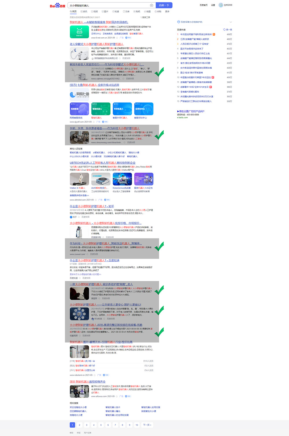 作为科技专注于失能失智人群护理内容倾力打造:机器人护理+智能护理平台+智慧医疗护理体系,公司高层与我司高管素有合作,对我们的SEO技术实力和网络营销策划能力很是认可,有推广项目,必定找我们。本次展示的是作为科技品牌霸屏营销推广,公司核心产品“大小便智能机器人”在首页10个快照位中,作为科技占据6条之多,首页前三位,作为科技占据2条。