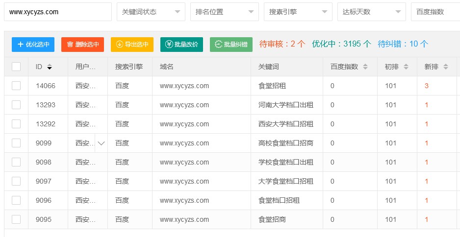 校园餐饮招商门户网,提交了8个关键词的优化,经过我公司优化,所有关键词全部排名首页前三位,7个词排名第一位。