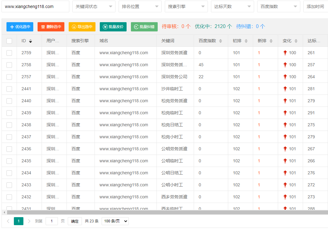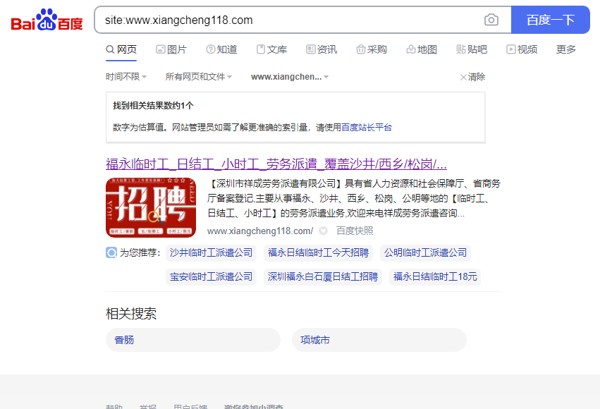 祥成劳务派遣使用我公司卓商站宝CMS建站,网站上线收录第一条开始,我们优化工作开展起来了,提交的几十个词全部排名首页第1位!!!,应客户要求,将已经上首页的小时工、临时工、日结工、劳务派遣、劳务公司、劳务派遣公司等热门泛搜索词去除取消优化,其他词效果稳定,一直都是第1位,上词率100%。