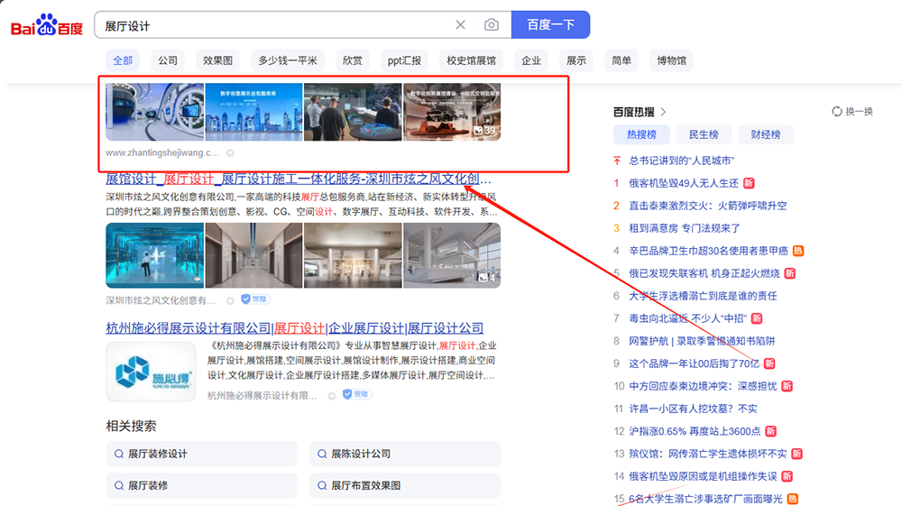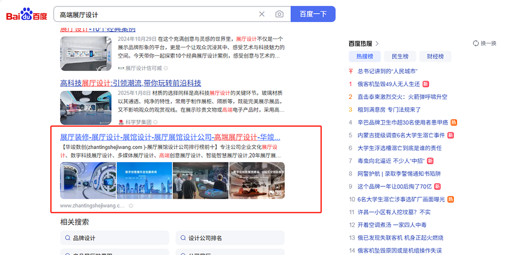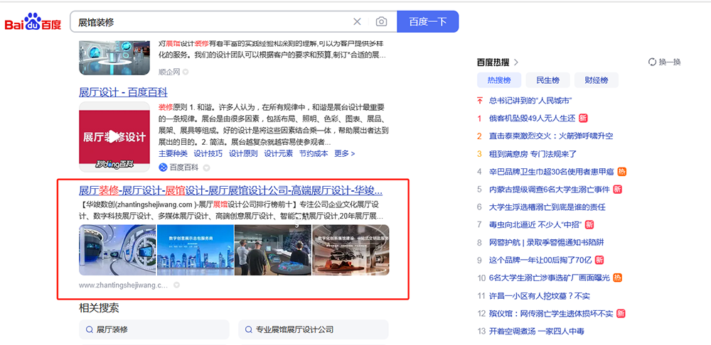 网站2025年6月3日上线(使用我公司专门研发的SEO建站系统搭建的站点),截止到2025年7月25日,,接近2个月的SEO优化,行业热门大词【展厅设计,展厅装修】等词排名搜索引擎首页。